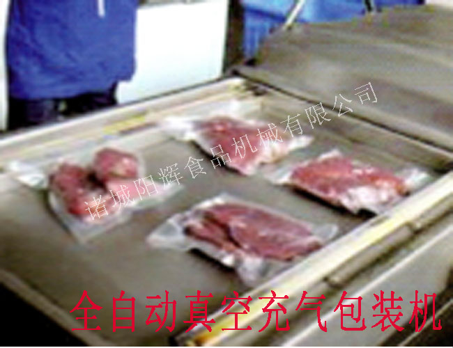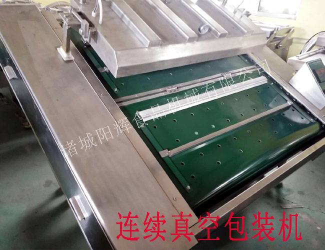 4,啟動連續(xù)真空包裝機,包裝機會自動走帶,抽真空,熱封口,之后繼續(xù)走帶,包裝好的產(chǎn)品滾動到接盤上,自動碼好。